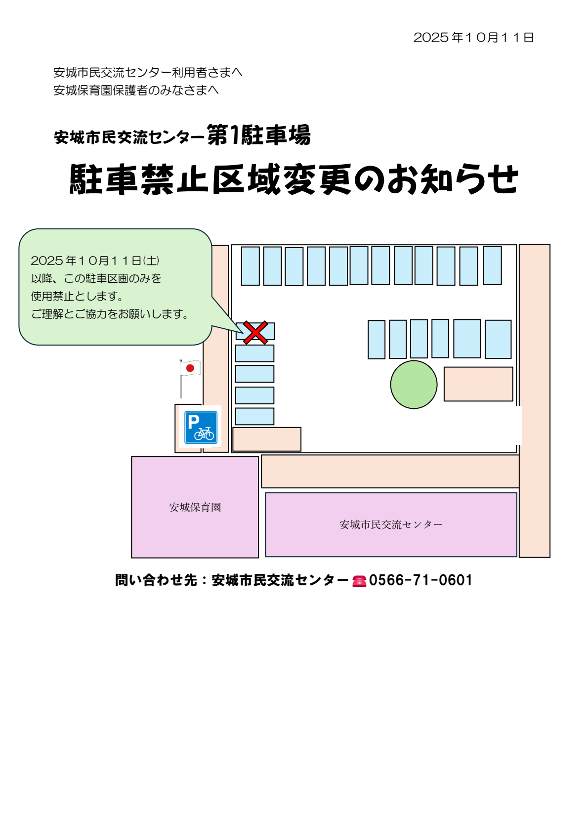 2025(令和7)年10月11日(土)より、第1駐車場の駐車禁止区域を以下のとおり変更いたします。